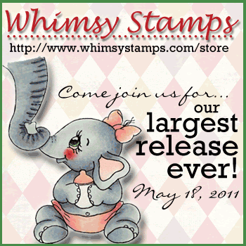 As I'm sure you know by now, Whimsy Stamps will releasing some new and amazing rubber stamps on May 18, including images and sentiments by our wonderful Whimsy designers: Crissy Armstrong, Melissa Jenkins (Meljens), Kenny K and Ann Vento of Raindrop Echo Designs.